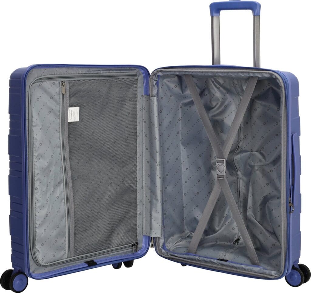 Að innan er ferðataskan skipt í tvo hluta: Önnur hliðin er hægt að loka með skilrúmi sem hefur hagnýtan möskvavasa fyrir smáhluti, en hin hliðin er með festingarólum sem halda fötum á sínum stað á meðan á ferð stendur.