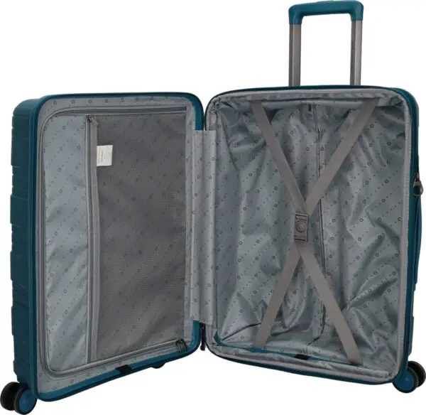 Að innan er ferðataskan skipt í tvo hluta: Önnur hliðin er hægt að loka með skilrúmi sem hefur hagnýtan möskvavasa fyrir smáhluti, en hin hliðin er með festingarólum sem halda fötum á sínum stað á meðan á ferð stendur.