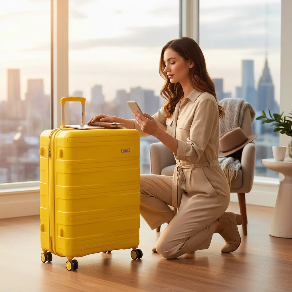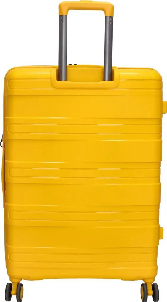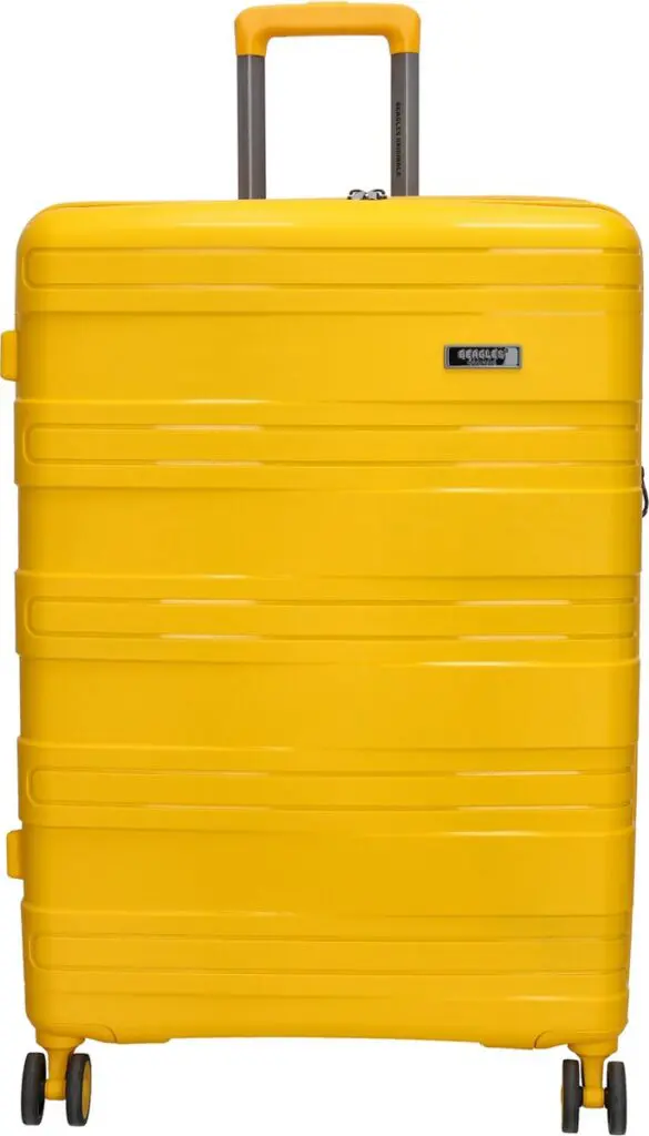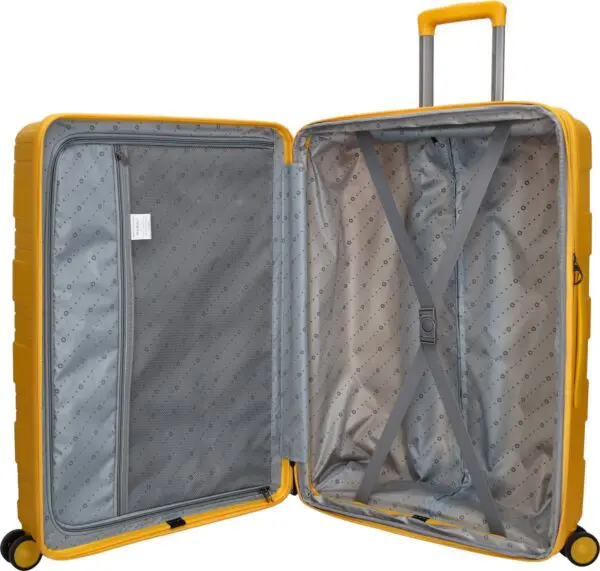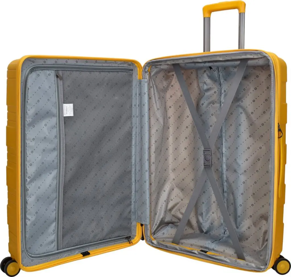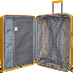 Stór, hörð ferðataska úr pólýprópýleni úr Travel Originals línunni frá Beagles Originals . Ferðataskan er með rennilás í fullri lengd sem hægt er að læsa með föstum TSA samsetningarlás að ofan. Innra byrðið er fóðrað og inniheldur rennilásarhólf, vasa með rennilás og ólar. Hún er einnig með handföng að ofan og á hliðunum og þægilegt tvöfalt fjögurra hjóla kerfi.