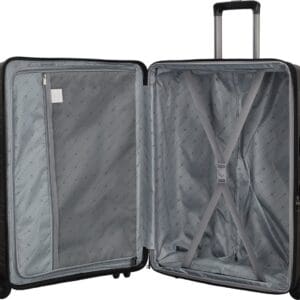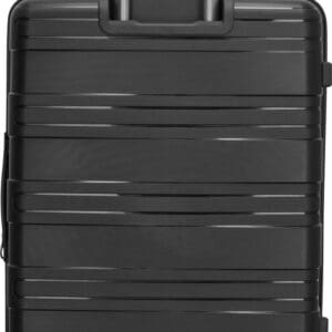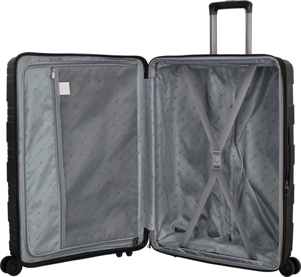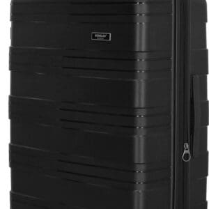 Stór, hörð ferðataska úr pólýprópýleni úr Travel Originals línunni frá Beagles Originals . Ferðataskan er með rennilás í fullri lengd sem hægt er að læsa með föstum TSA samsetningarlás að ofan. Innra byrðið er fóðrað og inniheldur rennilásarhólf, vasa með rennilás og ólar. Hún er einnig með handföng að ofan og á hliðunum og þægilegt tvöfalt fjögurra hjóla kerfi.