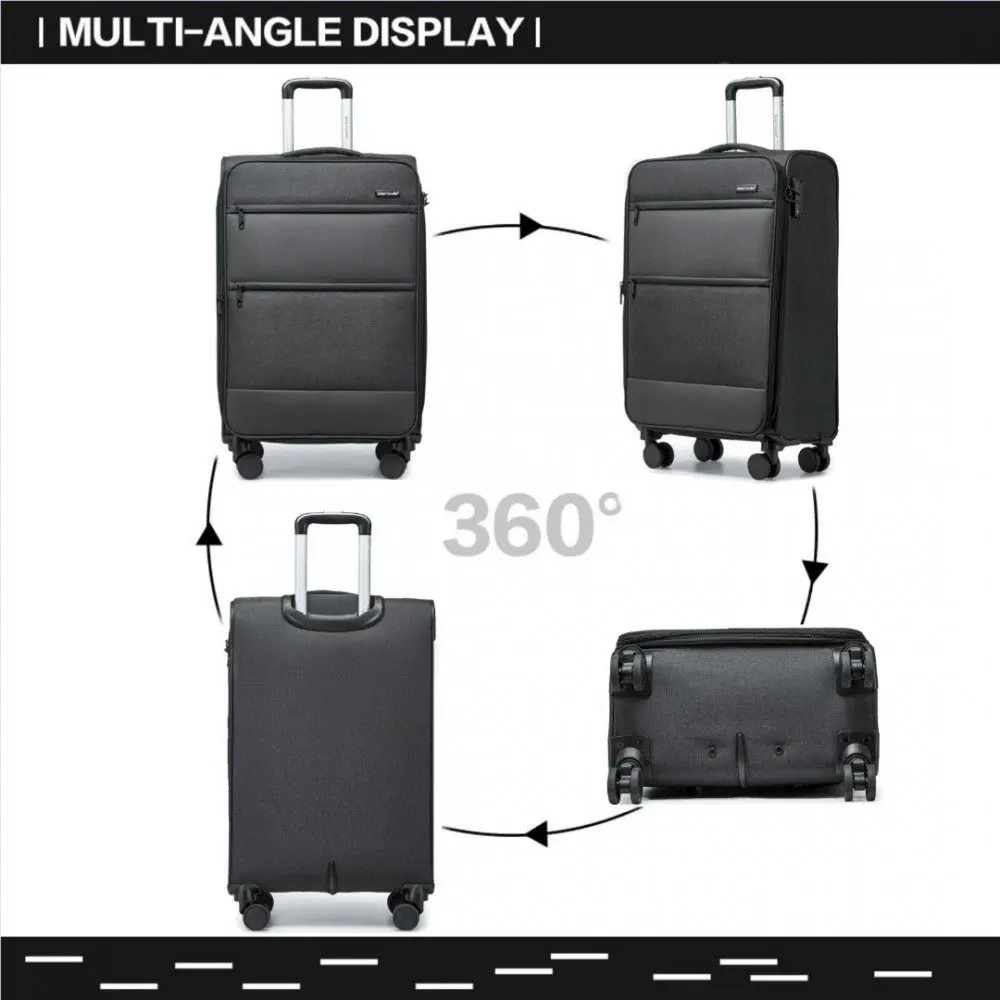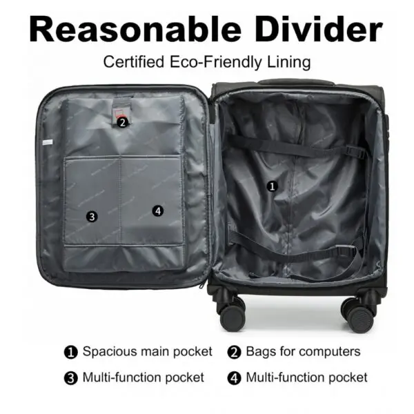 Innréttingin í 20" ferðatöskunni er hugsuð og búin tölvuhólfi fyrir tæki allt að 15.6 tommur. 24" og 28", koma með renndum möskvavasa og tveimur teygjanlegum miðvösum fyrir litla fylgihluti, og hinni hliðinni fyrir fatnað, tryggt með tveimur stillanlegum sylgjum. 40 litra