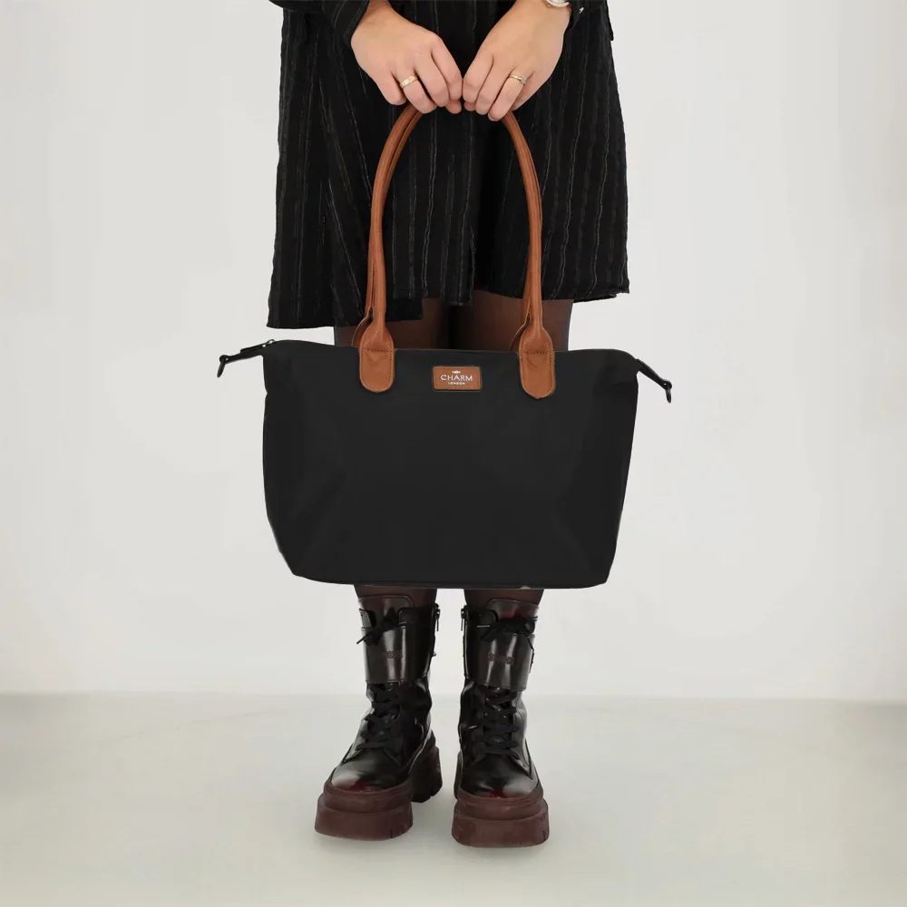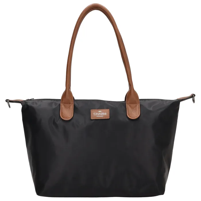 Þessi stílhreina handtaska er úr Buckingham línunni frá Charm London. Lágmarkshönnunin gerir hana fjölhæfa og sannarlega tímalausa. Hún rúmar auðveldlega allar nauðsynjar daglegs lífs. Berðu hana þægilega yfir öxlina með löngum handföngum eða með stillanlegri og færanlegri axlaról.