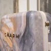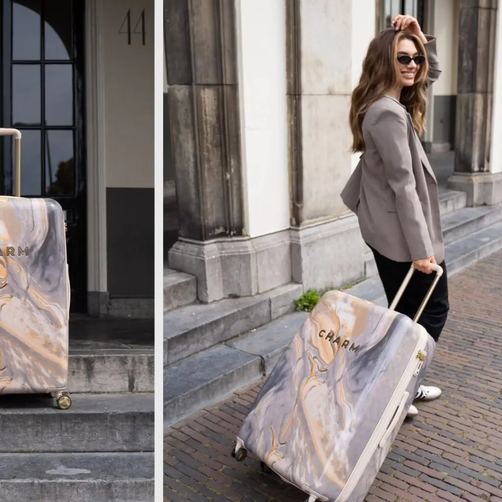 Hversu fallegt er þetta marmaraprentun! Þessar ferðatöskur munu auðveldlega finna viðskiptavini þína á farangurshringnum. Með stóru og litlu ferðatöskunni ertu tilbúinn í komandi ferðir. Með tveimur rúmgóðum hólfum: eitt með rennilás og annað með teygjuböndum til að festa farangur. TSA læsingin að utan veitir aukið öryggi og tryggir öryggi farangurs án þess að hindra öryggiseftirlit.