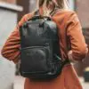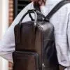 Þessi leðurbakpoki samanstendur af tveimur hlutum. Að framan er rúmgott aðalhólf með skipuleggjara til að geyma kort og penna og snjallsímahólf. Að aftan er sérstakur rennilásvasi fyrir fartölvu allt að 14 tommu.