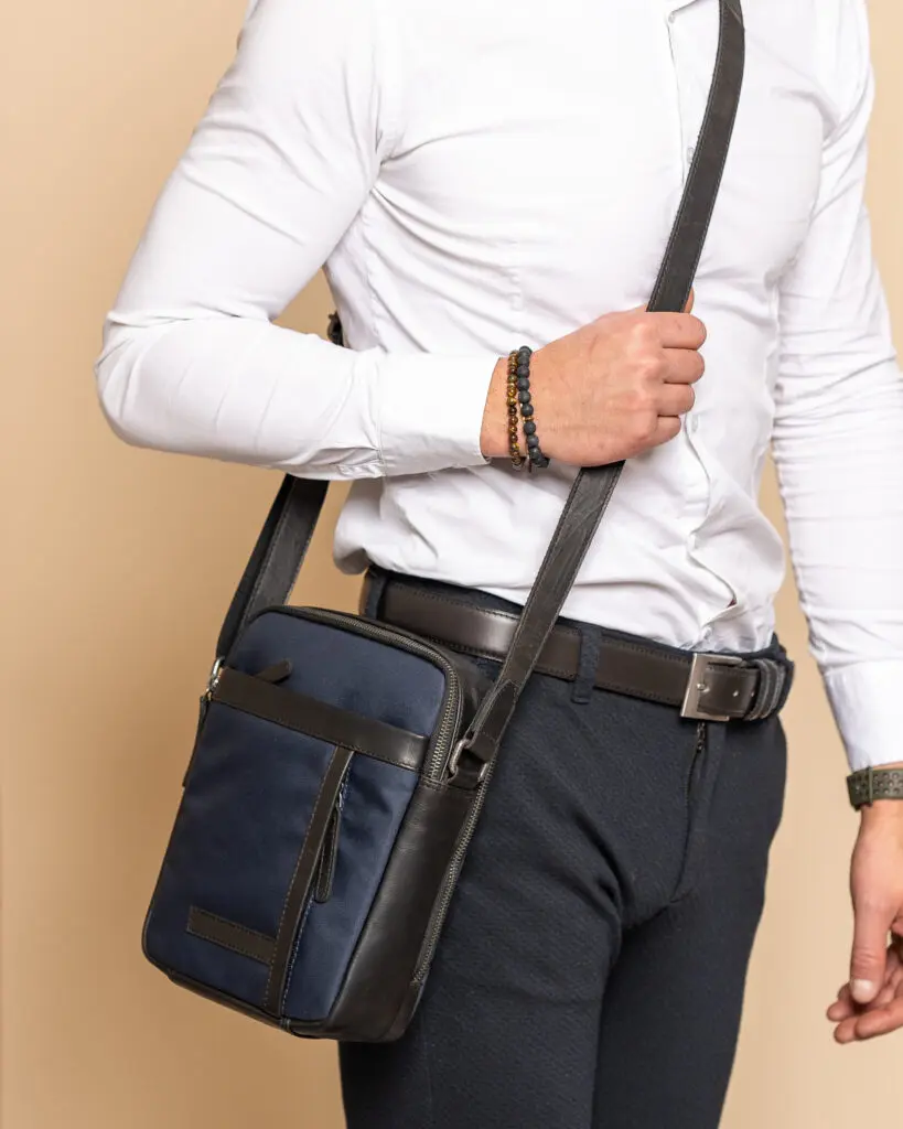 Mikeli er fjölhæf og hagnýt taska sem passar við hvaða föt sem er. Þessi axlartaska frá The Chesterfield Brand er úr 100% endurunnu nyloni og vinsæla vaxhúðuðu Pull Up Leðrinu okkar. Mikeli hefur verið hannaður með bæði stíl og virkni í huga, sem gerir hann að kjörnum félaga fyrir hvaða tilefni sem er, hvort sem þú ert á ferðinni eða á frídegi. Stillanleg axlaról tryggir að þú getir klæðst Mikeli á þægilegan hátt, nákvæmlega í þeirri lengd sem þú vilt. Aðalhólfinu lokast með hagnýtri flipa, bæði með segulloku og rennilás, þannig að mikilvægum hlutum þínum sé haldið öruggum