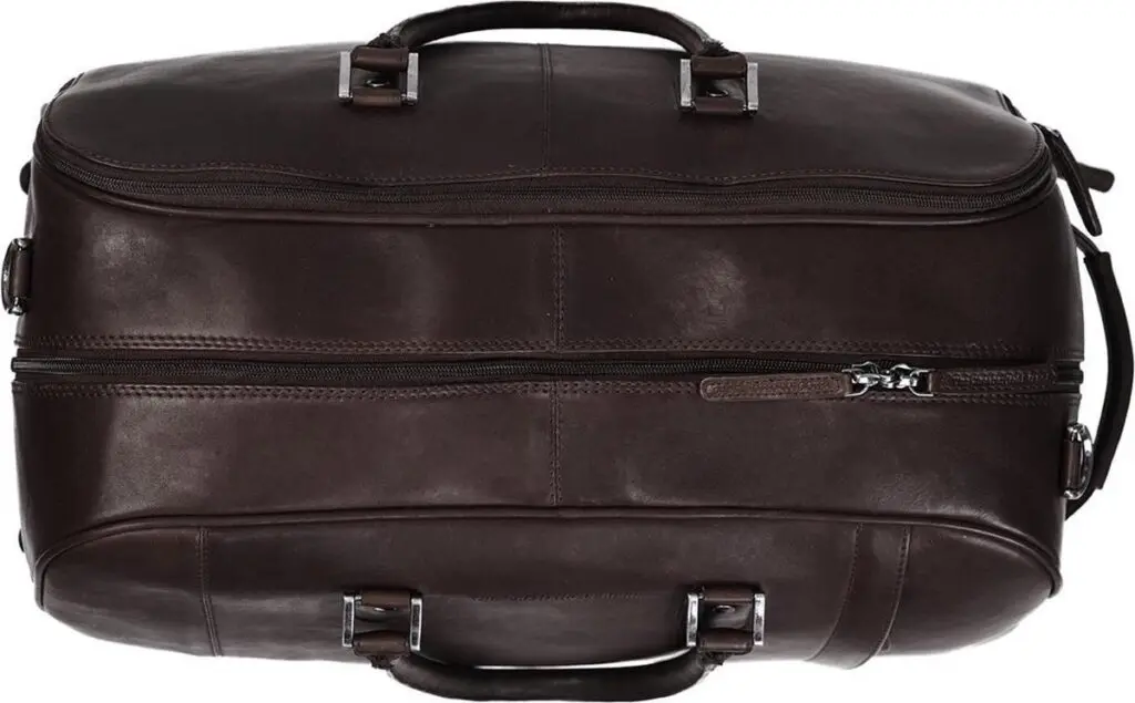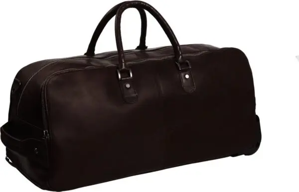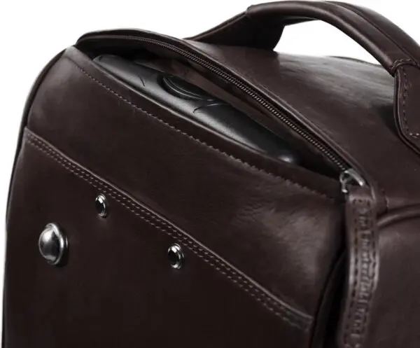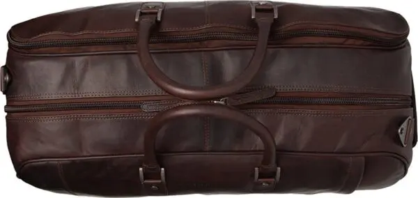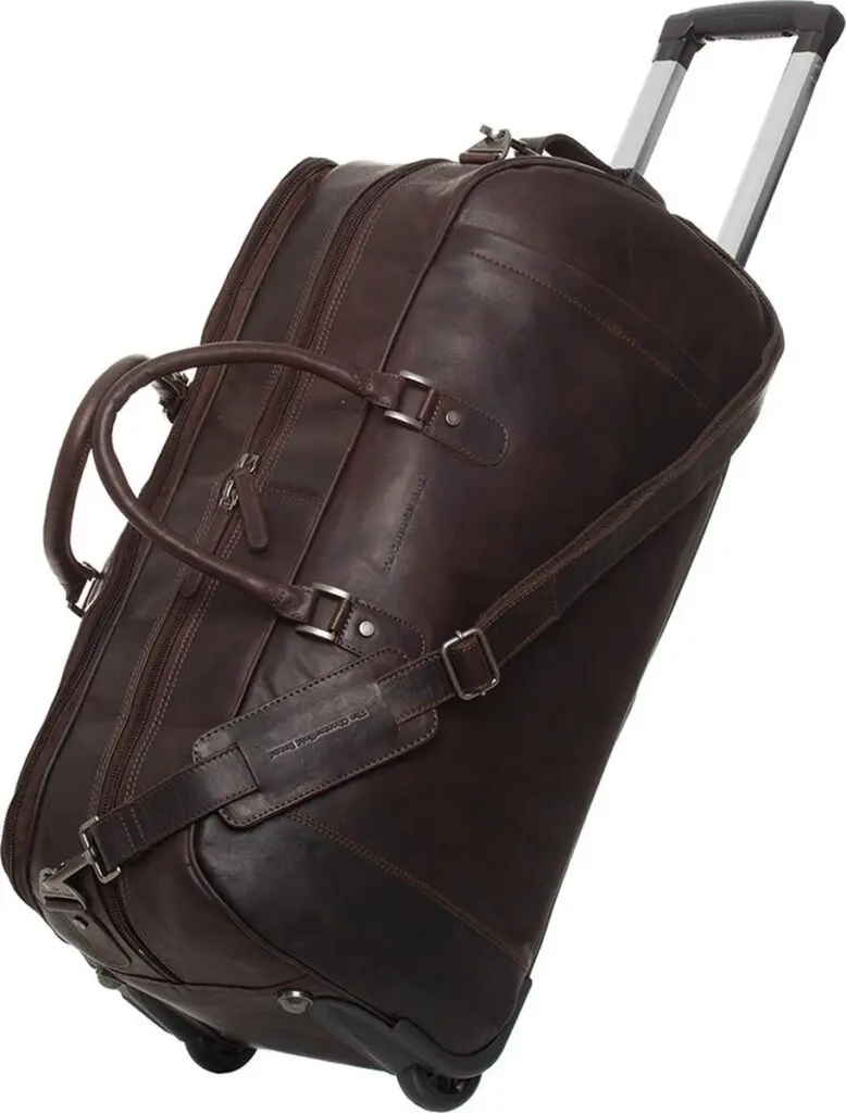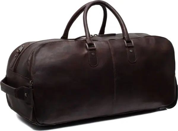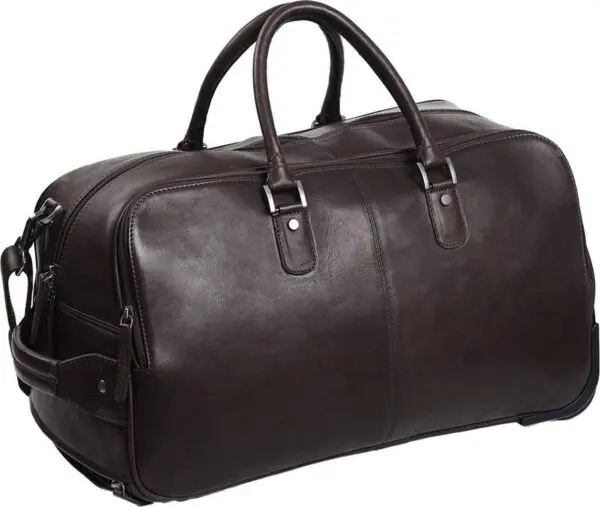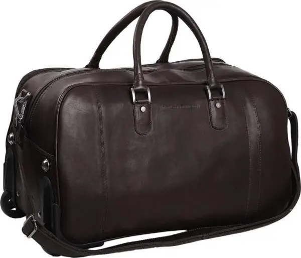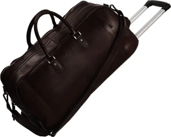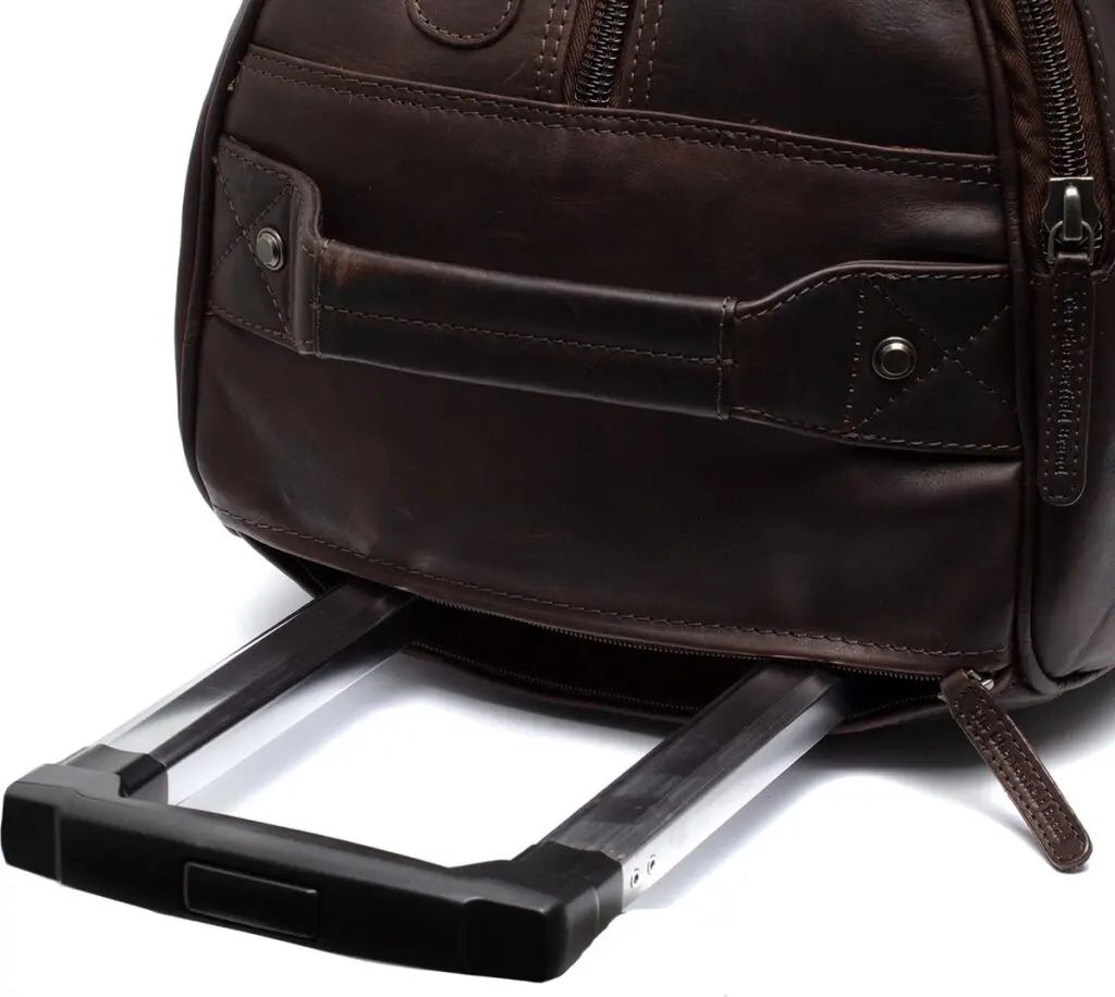 Einstök ferðataska úr leðri með traustu kerrukerfi, þægilegum hjólum og rúmum 47 lítrum.Þessi ferðataska úr leðri er fullkomin fyrir helgarferð eða viðskiptaferð. Ferðataskan í kerru er búin tveimur stórum almennum hólfum, ýmsum geymsluhólfum að innan og axlaról sem hægt er að taka af. Bæristöngin sem fellur saman er fallega falin og ferðataskan er með traustu handfangi að ofan.