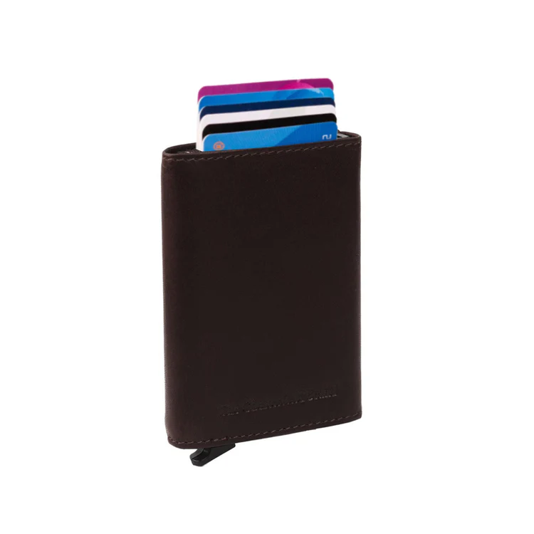 Stílhreint og öruggt kortaveski með RFID vörn úr hágæða gegnheilu áli. Þetta kortaveski er með leðurhlíf með þrýstihnappi þar sem hægt er að geyma bæði kort og seðla. Kjarninn er úr gegnheilu áli og búinn nýjustu RFID vörninni. Þegar þú togar litlu stöngina neðst á kortahaldaranum í átt að þér, koma kortin upp úr kortahaldaranum tröppulaga. Þannig hefurðu strax skýra yfirsýn yfir kortin þín og þú þarft ekki að leita að rétta kortinu og vasa að aftan fyrir annað kort. Í stuttu máli, örugg og hagnýt leið til að bera og geyma kortin þín.