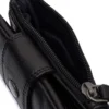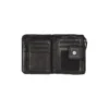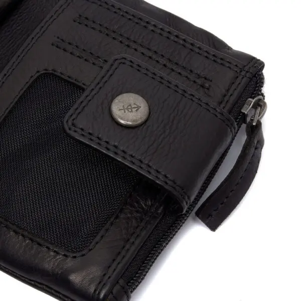 Þetta leðurveski samanstendur af tveimur hlutum. Aðalhólfið, sem lokast með smellu, rúmar átta kort. Þar er einnig geymsluhólf fyrir seðla. Tvö gegnsæ geymsluhólf leyfa þér að geyma mynd eða nafnspjöld. Aftan við þau er renniláshólf sem er nógu stórt til að geyma peningana þína á öruggan hátt.