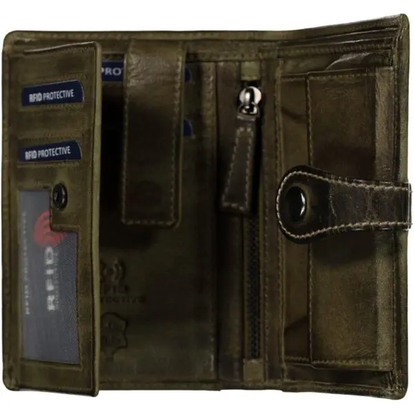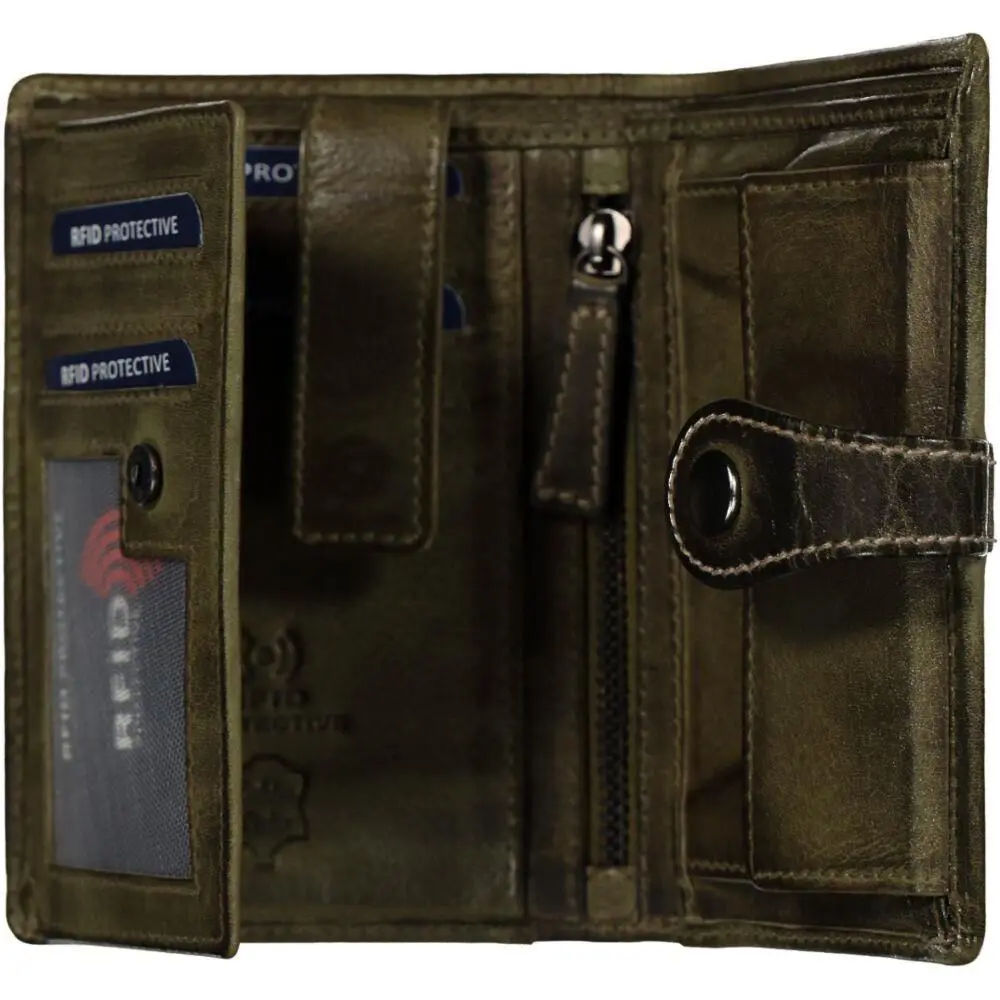 Stílhreint kvenveski úr ekta leðri með örlítið slitinni áferð. Það festist með hagnýtri ól með málmlás, sem tryggir öryggi og stílhreina áferð. Að innan eru fjölmörg hólf fyrir kort, skjöl og seðla sem auðvelda skipulag. Að auki er veskið búið RFID-tækni sem verndar gögn gegn rafrænum þjófnaði.