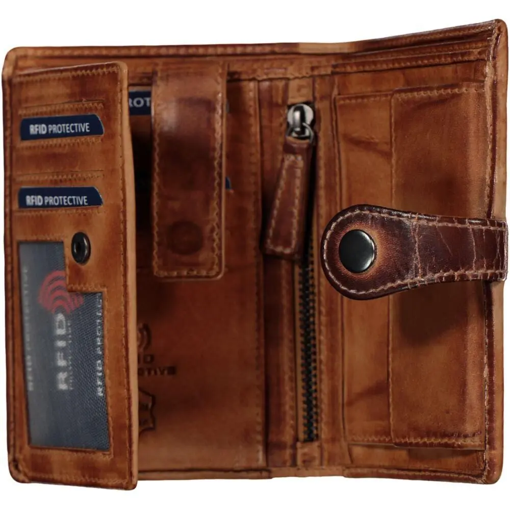 Stílhreint kvenveski úr ekta leðri með örlítið slitinni áferð. Það festist með hagnýtri ól með málmlás, sem tryggir öryggi og stílhreina áferð. Að innan eru fjölmörg hólf fyrir kort, skjöl og seðla sem auðvelda skipulag. Að auki er veskið búið RFID-tækni sem verndar gögn gegn rafrænum þjófnaði.