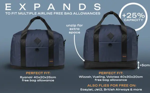 …eða stækkaðu út í 40x30x20cm fyrir ókeypis töskureglur flugfélaga eins og Play,Wizz, Volotea eða Vueling