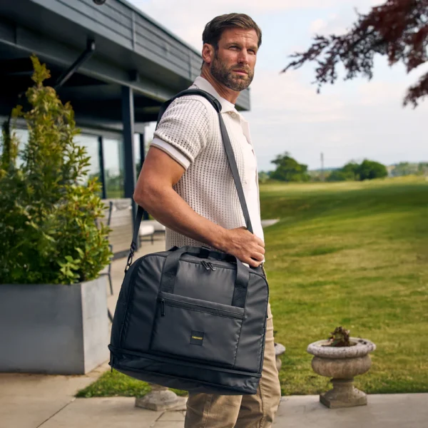 Endurunnið efni: Hannað úr sturtuþolnu 600D RPET-ofnu pólýesterefni sem er unnið úr endurunnum plastflöskum.