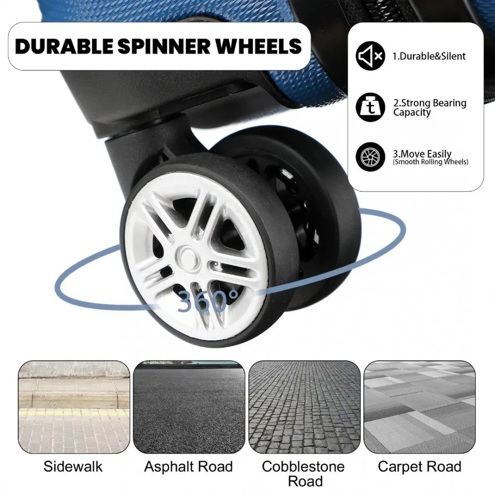 4 x 360° snúningshjól dreifa þyngd ferðatöskunnar jafnt og tryggja auðvelda svifflug um fjölfarna flugvelli eða lestarstöðvar.