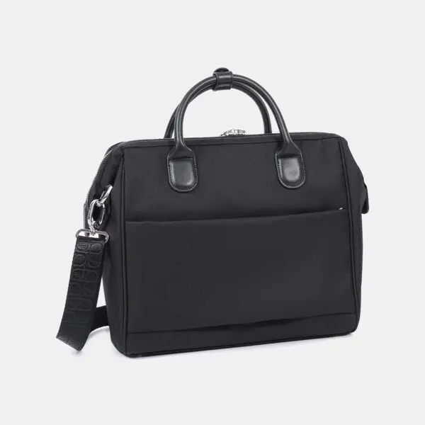 Galao-taskan er skipulagð og fagmannleg og lætur þig hlakka til viðskiptafunda. Formlegt viðskiptaútlit Að sjálfsögðu er endurunnið efni vatnsfráhrindandi og sæta spjaldið á framvasanum er rykfráhrindandi. Breiða, vefjaða axlarólin er laus og snjallt hulstur að aftan gerir hana fullkomna í ferðalög. En það eru vasarnir sem gera hana svo hagnýta. Aðalhólfið er með rennilásum sem læsast og opnast upp á gátt, svo þú getir séð nákvæmlega hvað þú ert með í fljótu bragði. Vasinn fyrir vatnsflösku er að innan sem gerir ytra byrðið glæsilegra og þar er RFID-vasi og bólstrað hulstur fyrir fartölvu eða spjaldtölvu. Þar er pláss fyrir síma og penna, auk stórs pappírshaldara og lauss vasa sem kemur