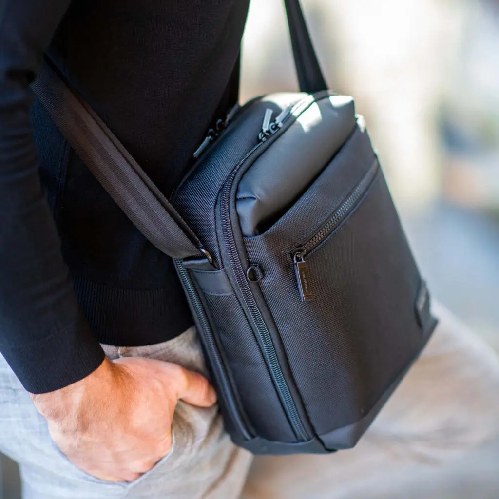 Hedgren Inc axlartaskan er fullkominn viðskiptafélagi. Sléttar, hreinar línur og áreynslulaus fagmennska hjálpa þér að halda þessum endalausa stíl sem er svo mikilvægur.Þessi taska svíkur þig ekki, með vatnsfráhrindandi áferð og rými fyrir allar nauðsynlega vinnuþætti. Það er hólf fyrir spjaldtölvuna þína, haldari fyrir símann þinn og keðju til að festa lyklana við svo þú týnir þeim aldrei. Við höfum meira að segja fylgt með RFID vörn til að halda kortunum þínum og skjölum öruggum.