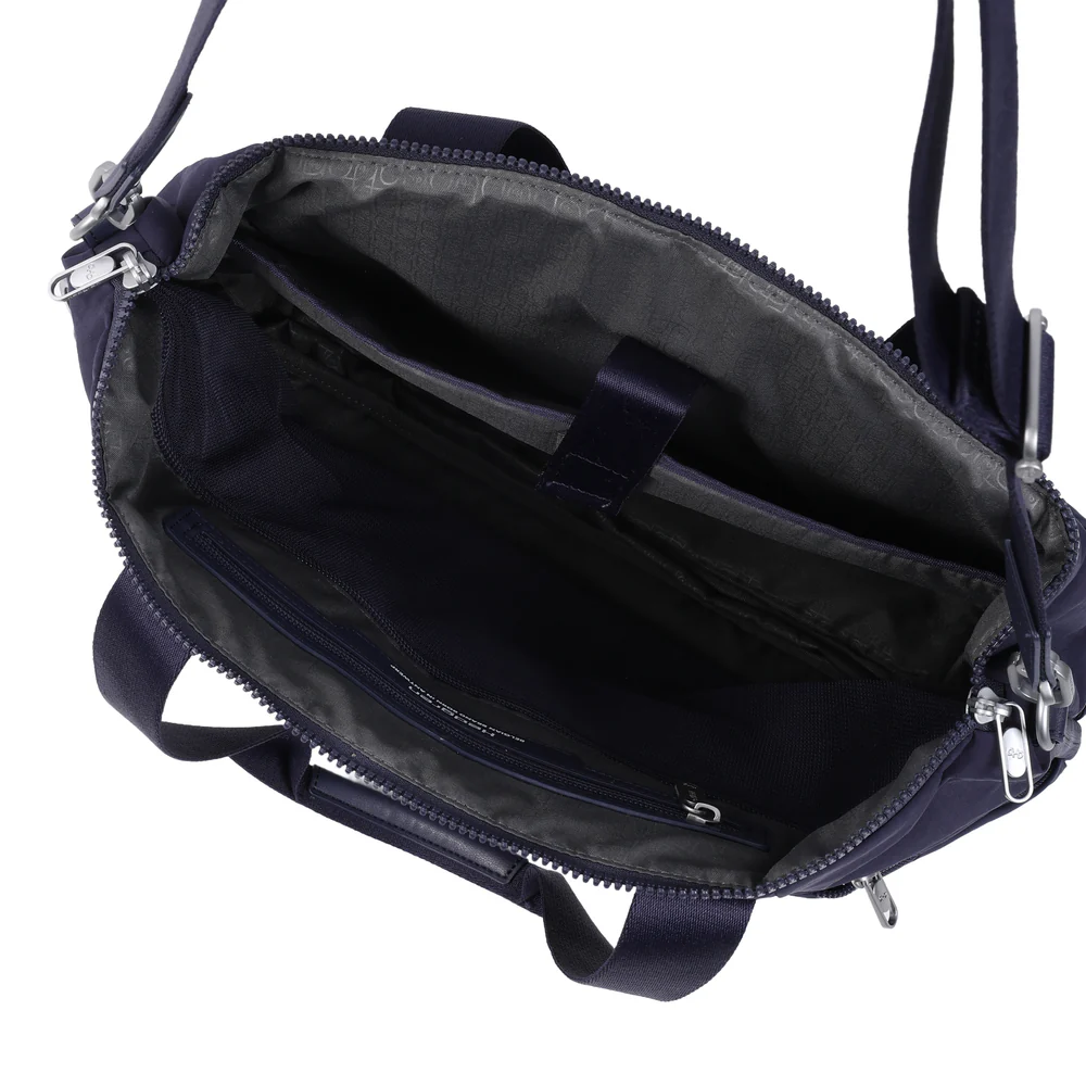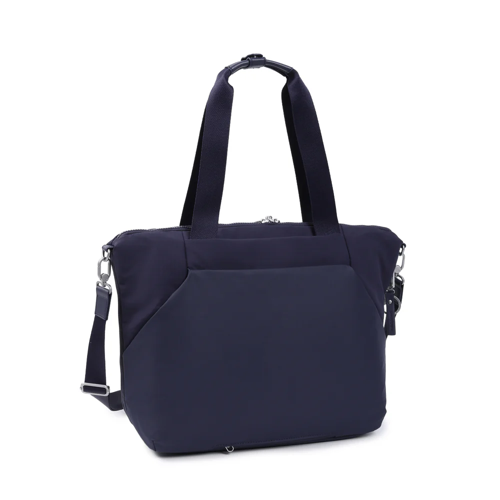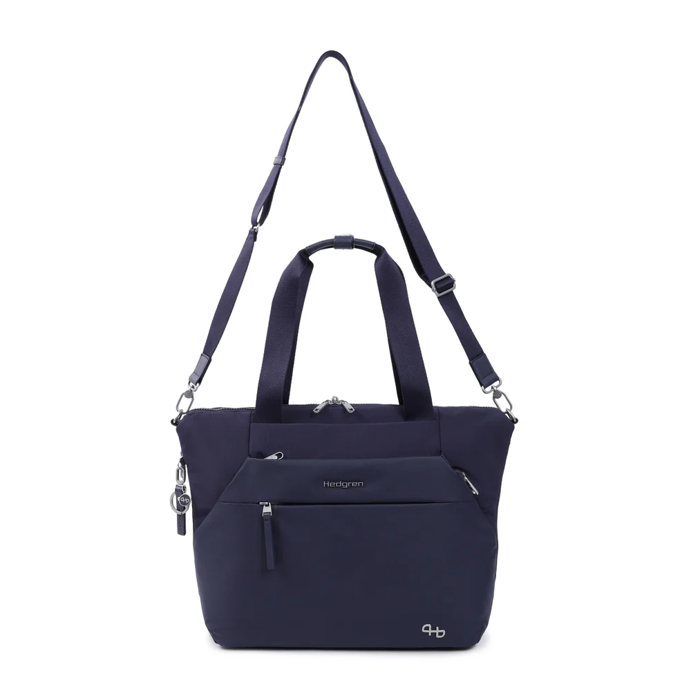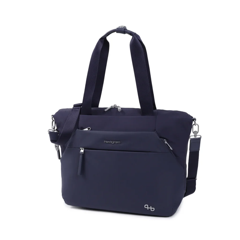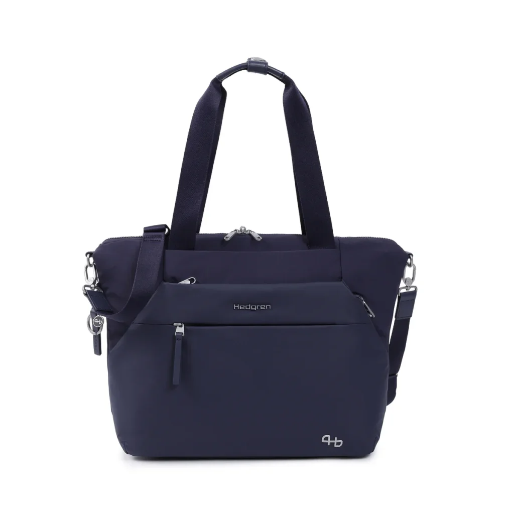 Þessi lárétta töskutaska getur rúmað allt skipulag fyrirtækisins, með rúmgóðu aðalhólfi sem stækkar til að rúma allar A4 skrár og möppur sem þú gætir hugsanlega þurft. Hún stækkar alveg eins auðveldlega, þökk sé rennilásnum. Læsanlegir rennilásar hjálpa til við að halda eigum þínum öruggum.Þessi fjölhæfa taska er með eitt aðalhólf með fimm innri vösum, þar á meðal rými fyrir fartölvu, snúru og RFID-svæði fyrir kort. Að utan eru sjö vasar, þar á meðal þrír fyrir vatnsflöskur eða regnhlífar og frábært innbyggt snjallhólf sem rennur yfir handfangið á ferðatöskunni þinni í ferðalögum. Mjúka ytra byrðið er að hluta til úr endurunnu efni og lítur frábærlega út, með lágmarks- og fáguðum stíl sem er fullkominn fyrir vinnu.