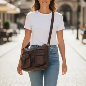 Ertu að leita að axlartösku sem er bæði stílhrein og hagnýt? Þessi leðurtaska frá Hide & Stitches er einmitt það sem þú þarft! Hágæða leðrið gefur töskunni lúxuslegt útlit, en rúmgott aðalhólf og ýmsar geymsluvasar tryggja hagnýta skipulagningu.