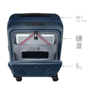 Framan á ferðatöskunni er renniláshólf, þar á meðal tveir vasar úr möskva-rennlásum – einn hannaður fyrir fartölvu og hinn fyrir önnur raftæki eins og iPad, festur með spennuól.