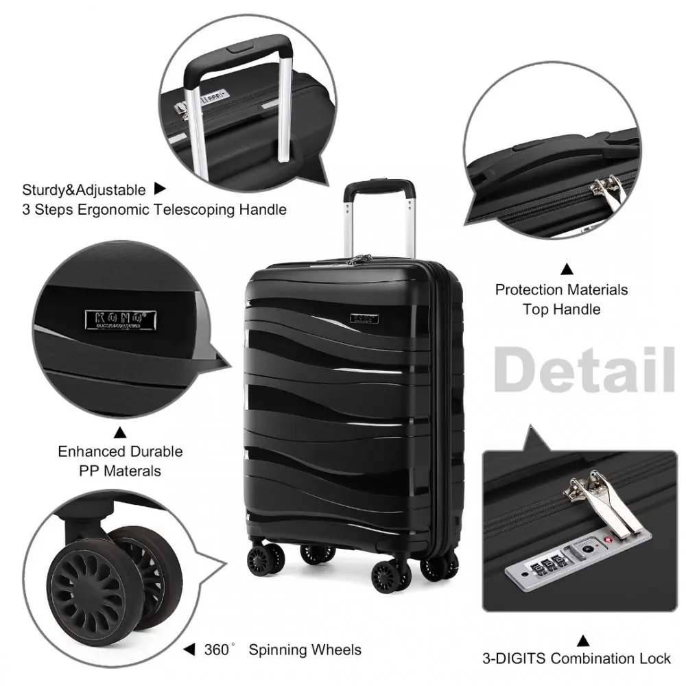 Þetta ferðatöskusett er úr úrvals pólýprópýlenefni. Pólýprópýlen (PP) er aðallega hentugt fyrir flugvörur,hefur eiginleika fallvarnar, sprengiþols og mikillar hörku. sem getur skapast strax eftir árekstur til að vernda farangurs. Nægt pláss fyrir allar ferðaþarfir þínar frá löngu helgarfríi eða til lengri ferðar