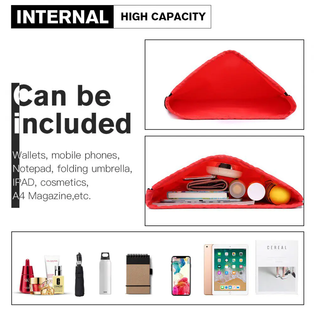 Nógu stór fyrir A4 hluti.Nóg pláss fyrir allar daglegar nauðsynjar: síma, veski/veski, lykla. Regnhlíf og vatnsflaska passa einnig í pokanum.