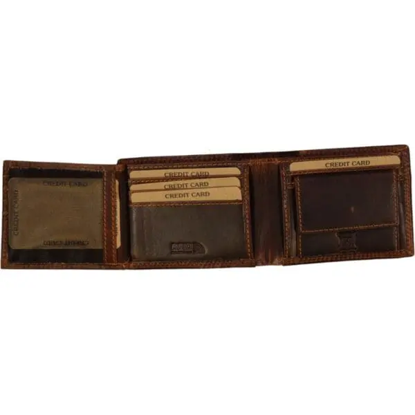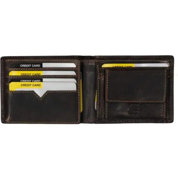 7 kortaraufar í veskinu 1 gegnsætt netvasi fyrir skilrýki tvö hólf fyrir seðla Leðurfóðrað myntveski með smellulokun málmmerki að framan