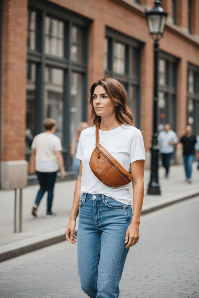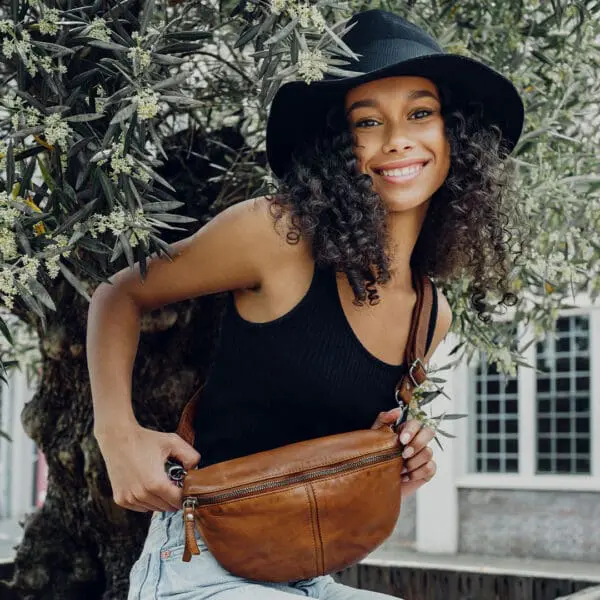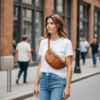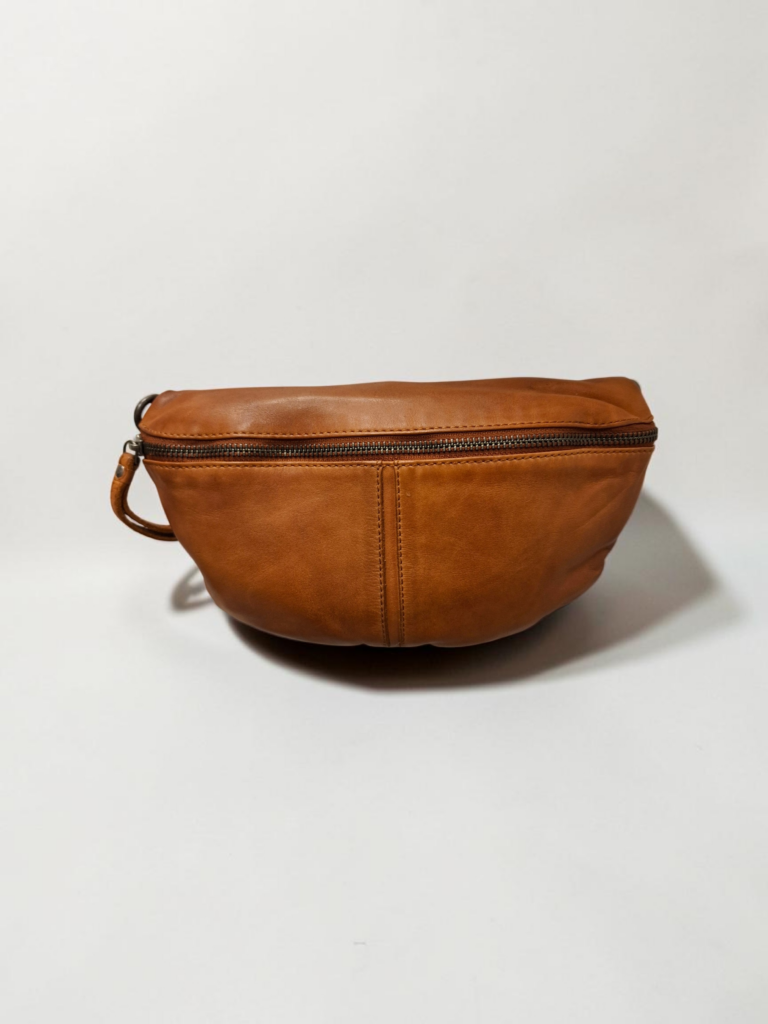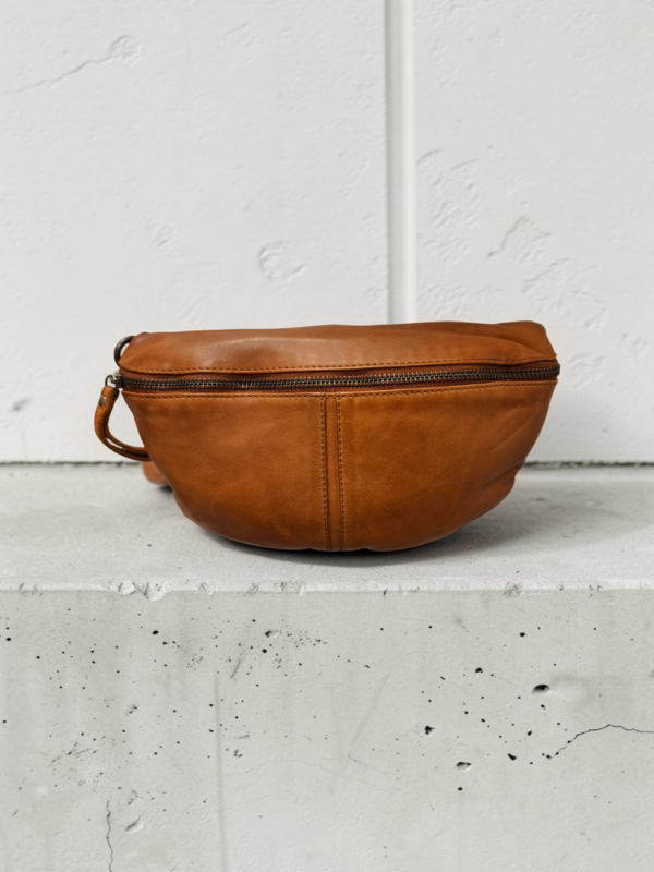 Manage leðurtaska með mitti eða axlarvef með rennilás að aftan, rennilás- og stingvasa að innan, stillanleg ól,