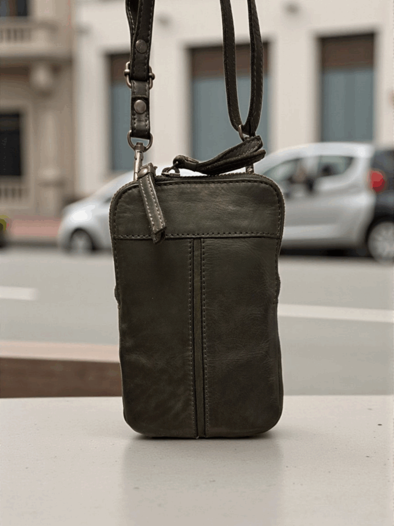 3 kortaraufar og vasi að innan, rennilásvasi að utan, þvegið fullkorns kúaleður.