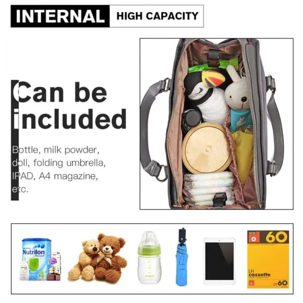 Getur geymt alls kyns barnadót, eins og bleiupúða, fóðurflösku, barnaleikföng, barnaföt og svo framvegis.