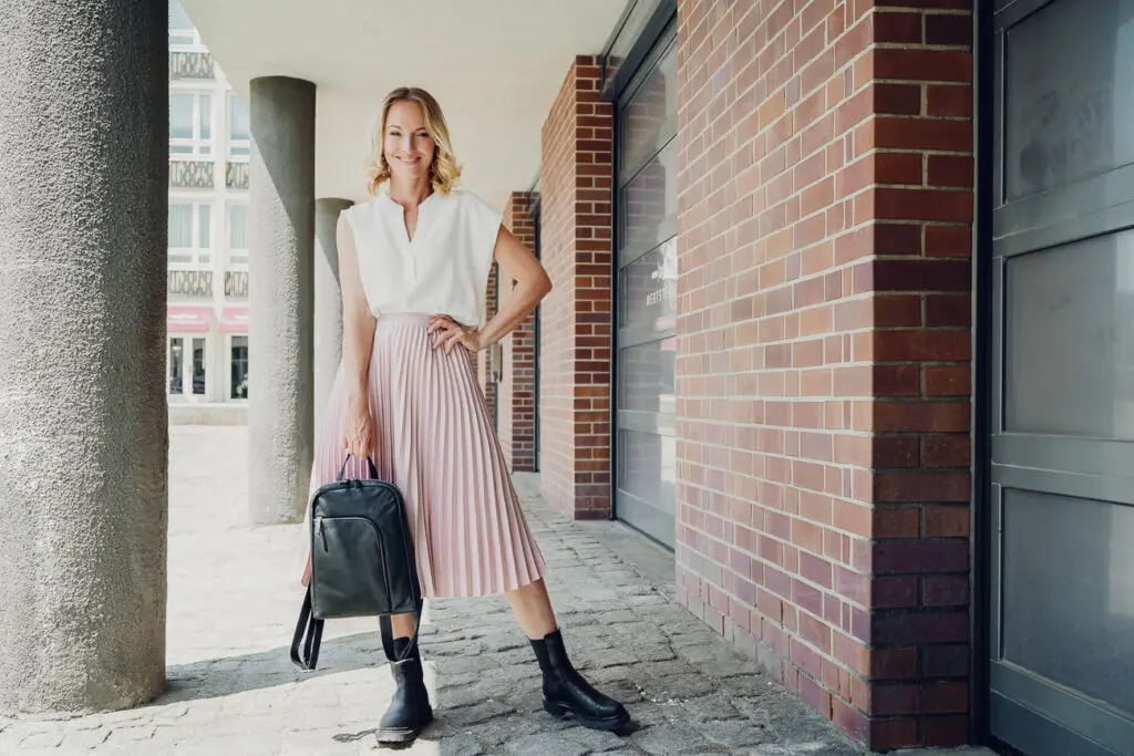 Stórt aðalhólf með rendum vasa ,annar opin vasi og penna vasar.Að framan er minna hólf og að aftan er rendur vasi.