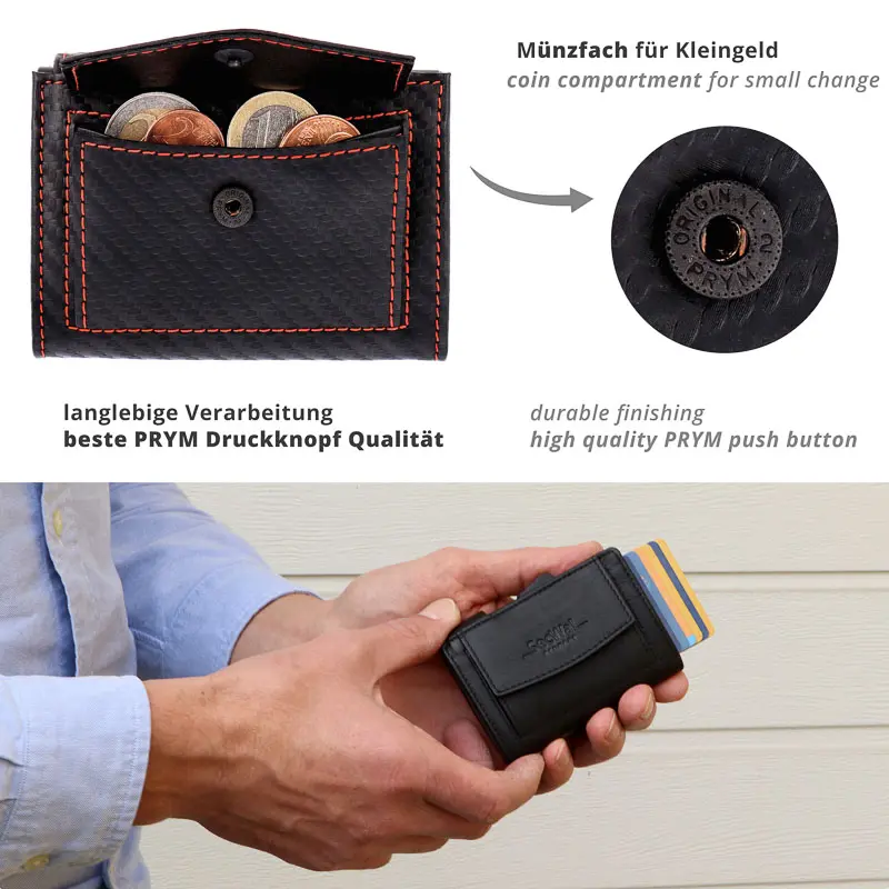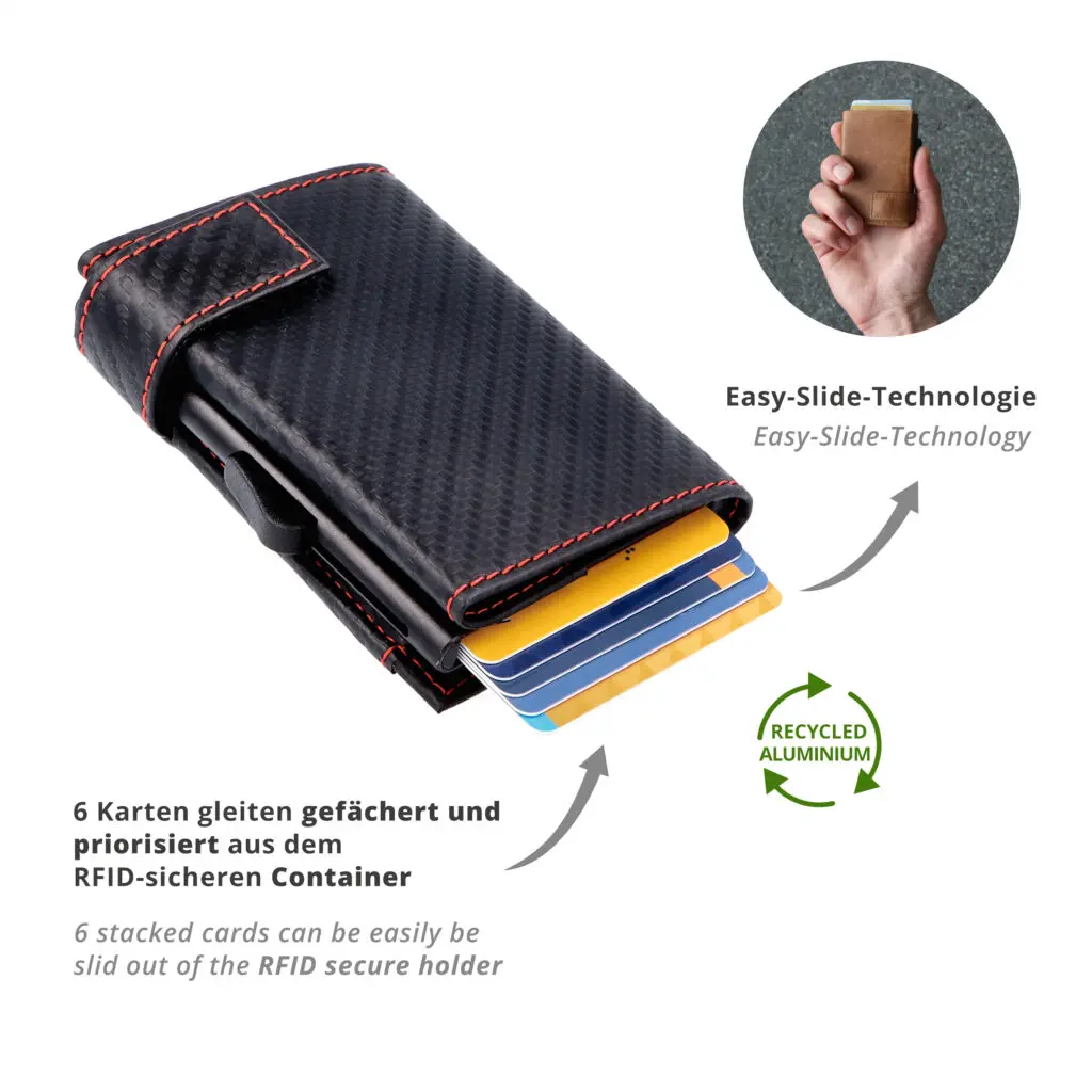 Þetta litla ósvikna leðurkortaveski með veski frá Secwal vörumerkinu nýtur mikilla vinsælda og er sannur skipulagsmeistari og augnayndi í senn. Létt álílátið hans hefur pláss fyrir allt að 6 kort, sem auðvelt er að ýta út með þumalfingri eða vísifingri með Easy-Slide tækninni (rennibúnaður). Ílátið er einnig RFID-öruggt (kortaupplestrarvörn). Hægt er að nota raufirnar tvær fyrir aukakort þegar hulstrið er opnað. Hólf fyrir seðla og rent sérhólf fyrir mynt fullkomna þessa einstöku vöru og veita þér hugarró að fjármálin eru alltaf á öruggum stað.