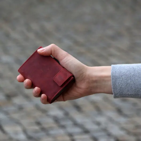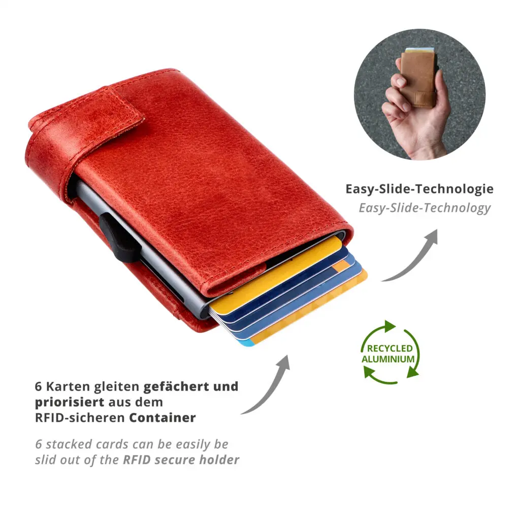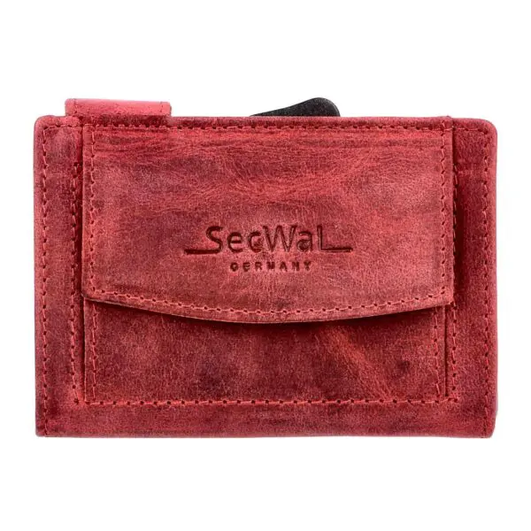 Þetta litla ósvikna leðurkortaveski með veski frá Secwal vörumerkinu nýtur mikilla vinsælda og er sannur skipulagsmeistari og augnayndi í senn. Létt álílátið hans hefur pláss fyrir allt að 6 kort, sem auðvelt er að ýta út með þumalfingri eða vísifingri með Easy-Slide tækninni (rennibúnaður). Ílátið er einnig RFID-öruggt (kortaupplestrarvörn). Hægt er að nota raufirnar tvær fyrir aukakort þegar hulstrið er opnað. Hólf fyrir seðla og sérhólf með smelluhnappi fyrir mynt fullkomna þessa einstöku vöru og veita þér hugarró að fjármálin eru alltaf á öruggum stað.
