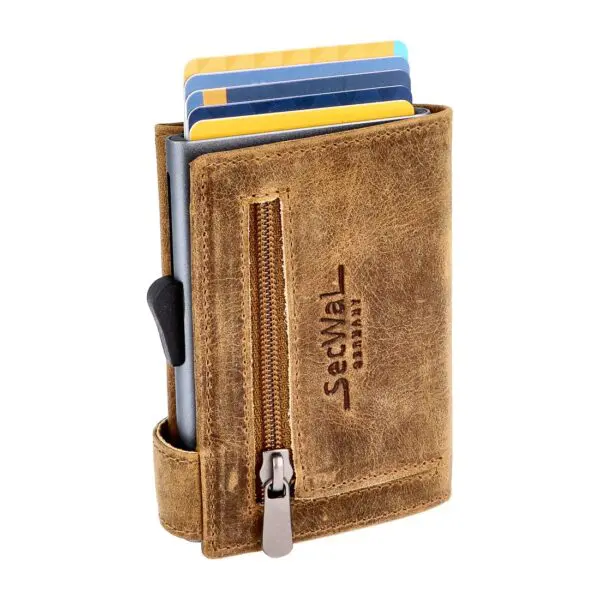 Þetta litla ósvikna leðurkortaveski með veski frá Secwal vörumerkinu nýtur mikilla vinsælda og er sannur skipulagsmeistari og augnayndi í senn. Létt álílátið hans hefur pláss fyrir allt að 6 kort, sem auðvelt er að ýta út með þumalfingri eða vísifingri með Easy-Slide tækninni (rennibúnaður). Ílátið er einnig RFID-öruggt (kortaupplestrarvörn). Hægt er að nota raufirnar tvær fyrir aukakort þegar hulstrið er opnað. Hólf fyrir seðla og rent sérhólf fyrir mynt fullkomna þessa einstöku vöru og veita þér hugarró að fjármálin eru alltaf á öruggum stað.