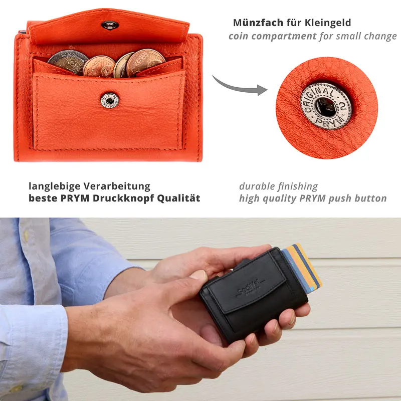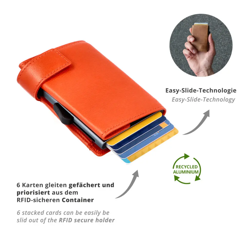 Þetta litla ósvikna leðurkortaveski með veski frá Secwal vörumerkinu nýtur mikilla vinsælda og er sannur skipulagsmeistari og augnayndi í senn. Létt álílátið hans hefur pláss fyrir allt að 6 kort, sem auðvelt er að ýta út með þumalfingri eða vísifingri með Easy-Slide tækninni (rennibúnaður). Ílátið er einnig RFID-öruggt (kortaupplestrarvörn). Hægt er að nota raufirnar tvær fyrir aukakort þegar hulstrið er opnað. Hólf fyrir seðla og sérhólf með smelluhnappi fyrir mynt fullkomna þessa einstöku vöru og veita þér hugarró að fjármálin eru alltaf á öruggum stað.