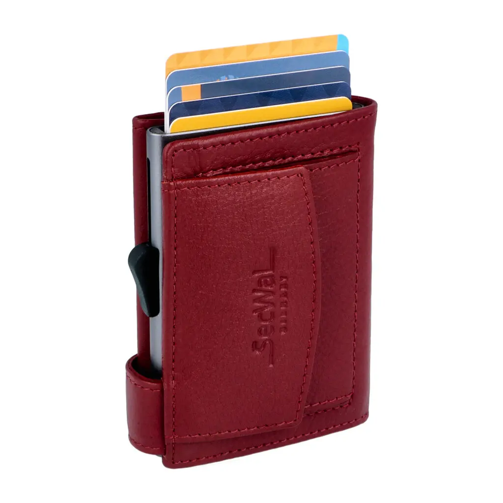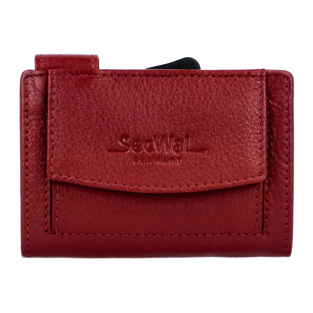 Þetta litla ósvikna leðurkortaveski með veski frá Secwal vörumerkinu nýtur mikilla vinsælda og er sannur skipulagsmeistari og augnayndi í senn. Létt álílátið hans hefur pláss fyrir allt að 6 kort, sem auðvelt er að ýta út með þumalfingri eða vísifingri með Easy-Slide tækninni (rennibúnaður). Ílátið er einnig RFID-öruggt (kortaupplestrarvörn). Hægt er að nota raufirnar tvær fyrir aukakort þegar hulstrið er opnað. Hólf fyrir seðla og sérhólf með smelluhnappi fyrir mynt fullkomna þessa einstöku vöru og veita þér hugarró að fjármálin eru alltaf á öruggum stað.