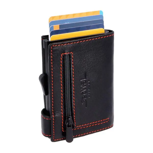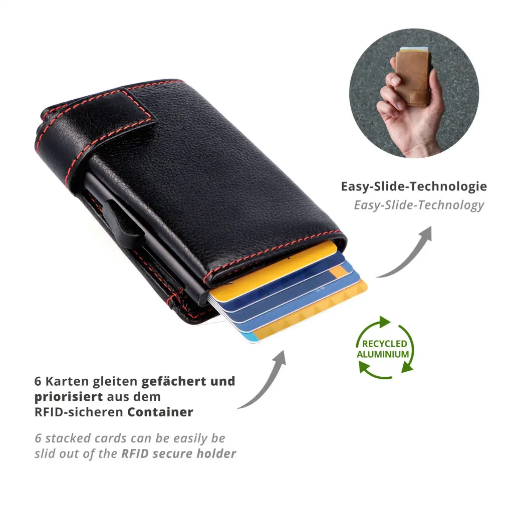 Þetta litla ósvikna leðurkortaveski með veski frá Secwal vörumerkinu nýtur mikilla vinsælda og er sannur skipulagsmeistari og augnayndi í senn. Létt álílátið hans hefur pláss fyrir allt að 6 kort, sem auðvelt er að ýta út með þumalfingri eða vísifingri með Easy-Slide tækninni (rennibúnaður). Ílátið er einnig RFID-öruggt (kortaupplestrarvörn). Hægt er að nota raufirnar tvær fyrir aukakort þegar hulstrið er opnað. Hólf fyrir seðla og rent sérhólf fyrir mynt fullkomna þessa einstöku vöru og veita þér hugarró að fjármálin eru alltaf á öruggum stað.