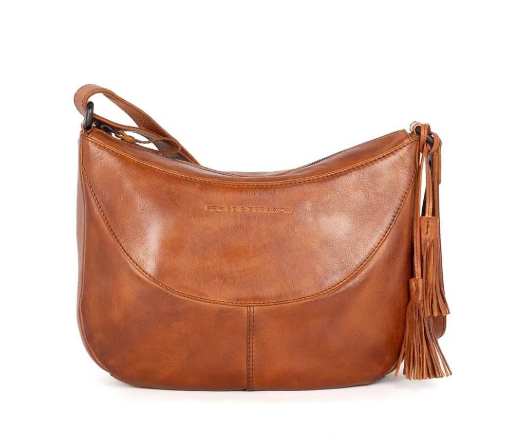 Elliana axlaveskið er stílhrein og kvenleg taska sem sameinar glæsileika og skemmtilega snertingu. Það er úr fallegu, mjúku leðri, það er mjúkt og gefur frá sér hlýlegt, náttúrulegt útlit. Leðrið batnar með aldrinum og þróar með sér einstakt útlit sem endurspeglar persónulegan stíl þinn. Hönnun Elliana er glæsilega ávöl og er með fínlegu upphleyptu Spikes & Sparrow merki að framan, sem gefur töskunni fágað útlit. Áberandi smáatriði eru skemmtilegu skúfarnir sem hanga frá hliðinni og gefa töskunni líflegt og töff útlit. Þessir skúfar eru vandlega smíðaðir úr sama mjúka leðrinu og bæta við fínlegri snertingu sem gefur töskunni þann auka blæ.