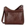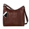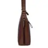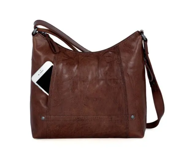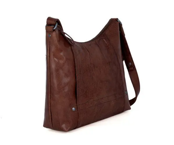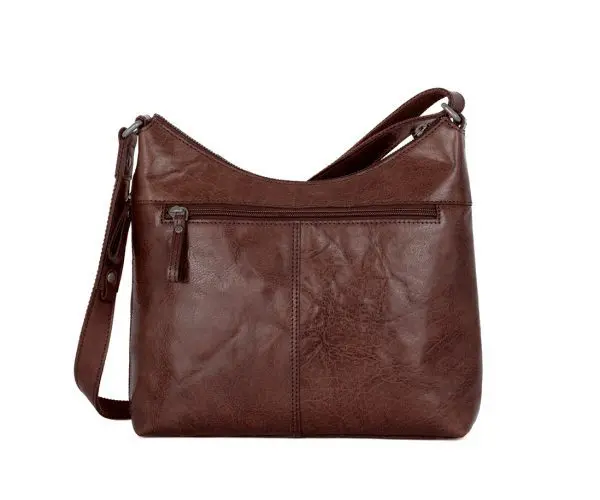 Litur: Dökkbrúnn Stærð: 28 x 9 x 26 cm Efni: Bronco leður Að utan: Falinn vasi að framan, aðalhólf með rennilás, hliðarvasi með rennilás, vasi með rennilás að aftan Að innan: Vasi með rennilás, innfelldur vasi, 2 pennalykkjur, lyklalykkja Handföng og ólar: Föst stillanleg löng axlaról