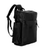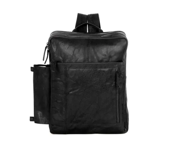 Að utan: 2 renndir vasar að framan, 2 rennilásar aðalhólf, renndur bakvasi, flöskuhaldari