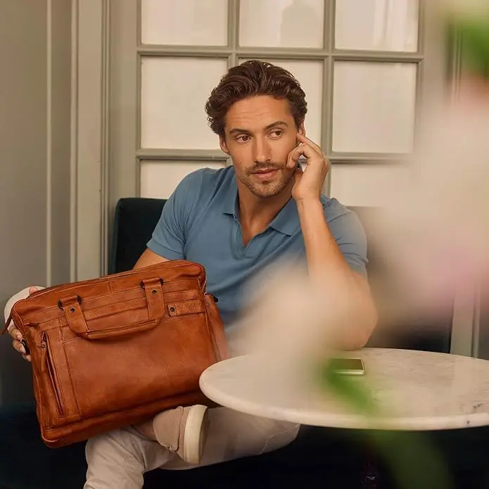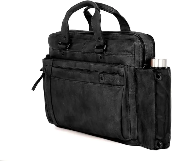 Vinnið með stíl með Brutus viðskiptatöskunni. Þessi leðurfartölvutaska er hönnuð með bæði glæsileika og virkni í huga og er fullkominn förunautur fyrir nútíma fagfólk. Hvort sem þú ert á ferðinni til og frá vinnu, ferðast eða á skrifstofunni, þá sameinar þessi taska hagnýtni og tímalausan stíl. Hún er með flöskuhaldara, falinni handfarangursól, bólstruðu fartölvuhólfi, kreditkortaraufum, snúruhaldara og rúmar 15,6 tommu fartölvu.