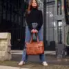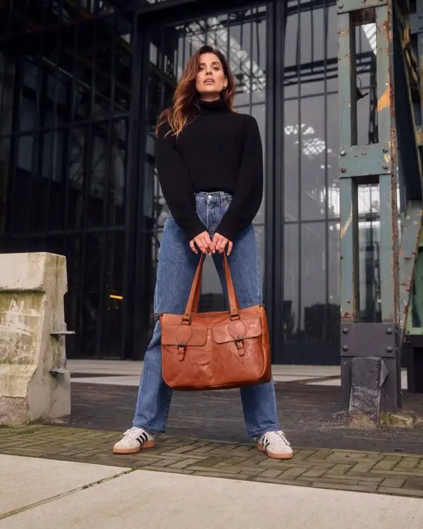 Fee fartölvuaxlartaskan er fullkomin blanda af stíl og virkni, sérstaklega hönnuð til að bera 15,6 tommu fartölvuna þína og aðra nauðsynjar með auðveldum og stílhreinum hætti. Taskan er með sérstökum froðuvasa að aftan fyrir 15,6 tommu fartölvuna þína. Að innan er rúmgott rými fyrir allar aðrar nauðsynjar, svo sem skjöl, hleðslutæki, síma og lykla. Tveir framvasar, með vestrænum innblásnum flipa og spennulokun, vekja strax athygli. Þessir smáatriði gefa töskunni skemmtilegan en samt harðgeran blæ, sem aðgreinir hana frá hefðbundnum fartölvutöskum. Málmnaglar og spennur undirstrika handunnið útlit hennar og auka sjálfbæra útlit.