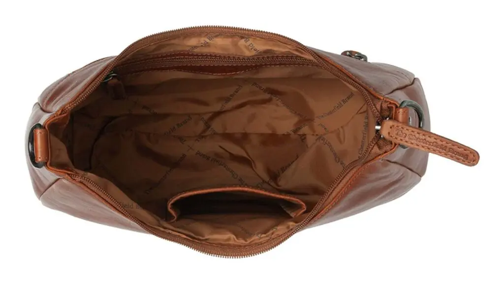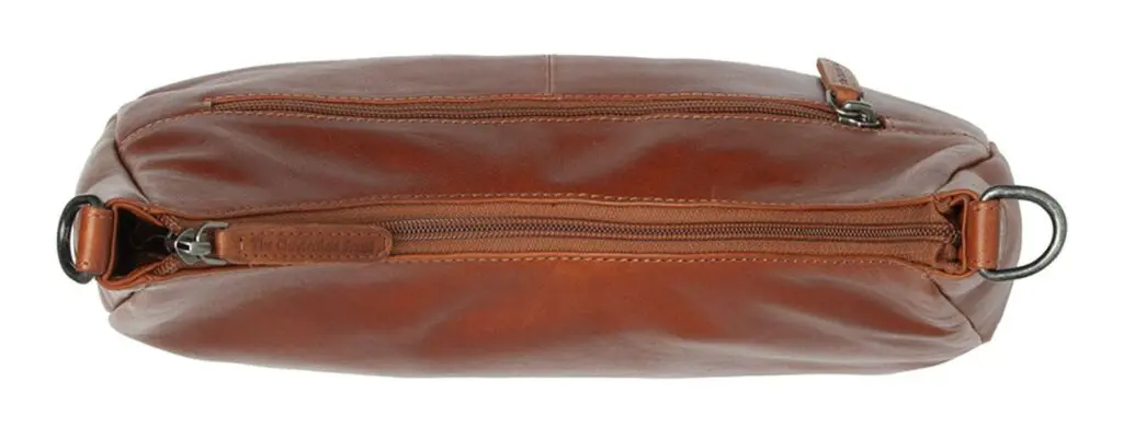 Alexandria er með aðalhólf með rennilás. Þessi taska rúmar fimm lítra og er nógu rúmgóður til að halda nauðsynjum þínum nálægt meðan þú ert á ferðinni! Þú getur örugglega geymt símann þinn, veskið, gleraugu, kort, eyrnatól og fleira í leðuraxlarpokanum. Inni í aðalhólfinu eru nokkrir geymsluvasar, þar af einn með rennilás.