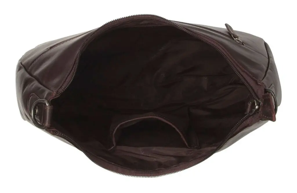 Alexandria er með aðalhólf með rennilás. Þessi taska rúmar fimm lítra og er nógu rúmgóður til að halda nauðsynjum þínum nálægt meðan þú ert á ferðinni! Þú getur örugglega geymt símann þinn, veskið, gleraugu, kort, eyrnatól og fleira í leðuraxlarpokanum. Inni í aðalhólfinu eru nokkrir geymsluvasar, þar af einn með rennilás.
