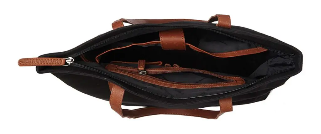 Alicia kemur með tvö löng handföng, svo þú getur annað hvort borið töskuna í hendinni eða hengt hana þægilega yfir öxlina. Rúmgóða aðalhólfið lokast örugglega með rennilás, sem gerir þér kleift að geyma allar nauðsynjar þínar á öruggan hátt.Inni í aðalhólfinu finnur þú nokkur geymsluhólf, geymsluhólf fyrir kortin þín, sem og fyrir síma, penna og jafnvel auka rennilásvasa fyrir aukið öryggi. Að auki er taskan með sérstakt fartölvuhólf sem hentar fartölvum allt að 14 tommu, sem gerir þér kleift að flytja rafeindatæki á öruggan hátt. Að utan, aftan á Alicia, er handhægt geymsluhólf með rennilás. Hér getur þú geymt mikilvæga hluti á öruggan hátt og samt haft þá fljótt við höndina.