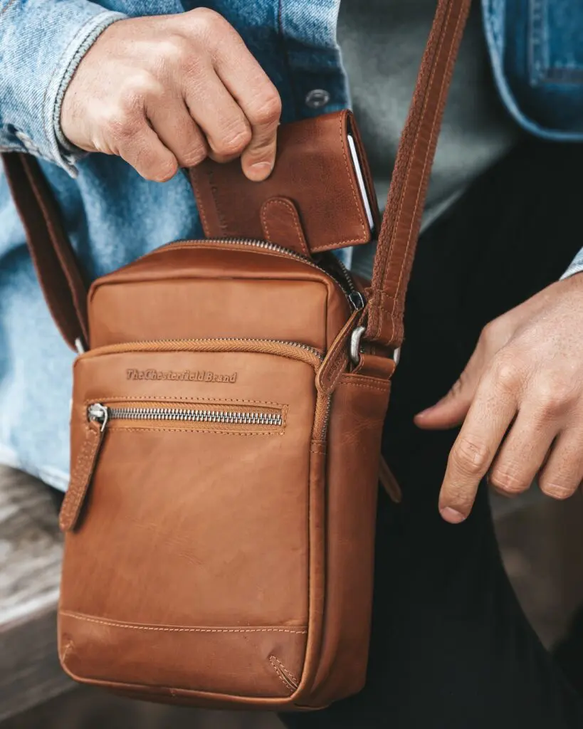 The Chesterfield Arenas Hagnýt leðurtaska til daglegrar notkunar er enginn lúxus. Með Arenas ertu kominn á réttan stað! Fullkomið til daglegrar notkunar til að bera allar nauðsynlegar nauðsynjar. Með töskunni fylgir stillanleg axlaról. Þetta gerir þér kleift að klæðast töskunni í hvaða lengd sem þú vilt. Aðalhólf töskunnar er með rennilás. Þetta hólf býður upp á nóg pláss fyrir það sem þú mátt ekki missa af; síma, lykla, (sól)gleraugu og veski. Inni í aðalhólfinu er auka geymsluhólf með rennilás og vasa fyrir símann þinn. Að framan eru tveir vasar með rennilás. Hér getur þú örugglega geymt smærri hluti og passað að missa þá ekki. Einnig á bakinu er vasi með rennilás til að geyma smáhluti.