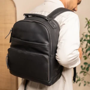 Aðalhólfið hefur styrktan vasa til að geyma spjaldtölvu eða minnisbók allt að 12.9 tommur. Ennfremur inniheldur aðalhólfið skipulag (til að geyma penna og kreditkort) og geymsluhólfið er með rennilás. Fartölvuhólfið er staðsett aftan á pokanum, hentugt fyrir fartölvur allt að 14 tommur. Ennfremur er þessi leðurbakpoki með þremur aukageymsluhólfum, drykkjarflöskuhaldara og óltil að hengja á ferðatöskuna.