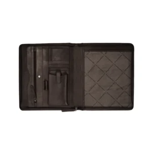 Þessi leðurmappa er með pláss fyrir minnisblokk í A4 stærð öðru megin. Hinu megin er A4 hólf sem þú getur einnig notað sem hólf fyrir spjaldtölvu. Að innan er einnig renniláshólf, hólf fyrir snjallsíma og ýmis kortahólf og önnur geymsluhólf. Mappan lokast með sterkum rennilás.