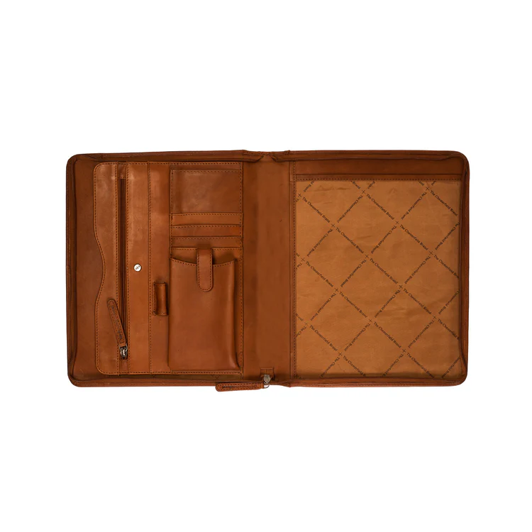 Þessi leðurmappa er með pláss fyrir minnisblokk í A4 stærð öðru megin. Hinu megin er A4 hólf sem þú getur einnig notað sem hólf fyrir spjaldtölvu. Að innan er einnig renniláshólf, hólf fyrir snjallsíma og ýmis kortahólf og önnur geymsluhólf. Mappan lokast með sterkum rennilás.