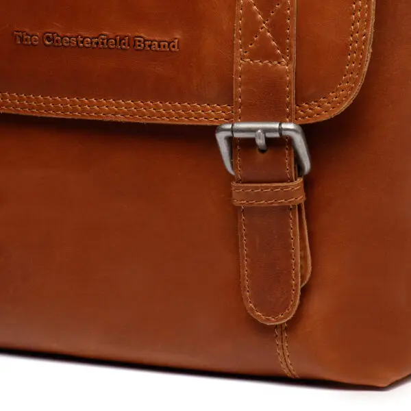 Adelanto frá The Chesterfield Brand. Ef þú ert að leita að daglegri tösku með meira geymsluplássi, þá er leðurtaska Adelanto frá The Chesterfield Brand fullkominn kostur.Leðuraxlarpokinn er með stillanlegri axlaról þannig að þú getur klæðst henni í hvaða hæð sem þú vilt. Pokinn lokar með loki með tveimur sylgjum, en lokunin er auðveldari með handhægum smellahnöppum undir sylgjunum. Undir flipanum er rúmgott aðalhólf sem lokast með rennilás. Þetta aðalhólf er búið styrktu spjaldtölvuhólfi.