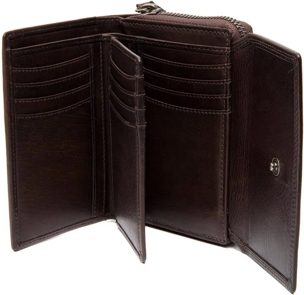Salviano er með tvö aðalhólf, sem gerir þér kleift að skipuleggja hlutina þína á skilvirkan hátt. Eitt aðalhólf opnast með loki og tveimur smelluhnöppum, sem gerir það auðvelt að festa það jafnvel þegar það er fullt. Þetta hólf gefur pláss fyrir allt að sextán kort og inniheldur ýmsar raufar fyrir seðla, kvittanir og nafnspjöld. Hitt aðalhólfið lokast með rennilás og er deilt með auka rennilásvasa. Á hvorri hlið þessa vasa finnurðu raufar fyrir fjögur kort í viðbót. Þetta hólf hefur líka nóg pláss fyrir mynt.