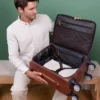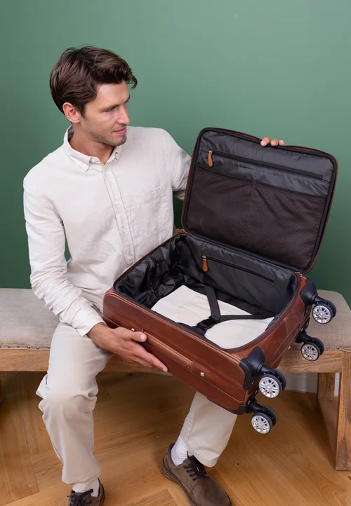 Lúxus leðurferðartöskunni San Marino frá The Chesterfield Brand er sannkallað augnafang fyrir þá sem vilja ferðast með stíl. Þessi ferðataska er ekki aðeins mjög stílhrein heldur einnig hagnýt og hagnýt. Með fjórum mjúkum hjólum og þægilegu ferðakerfi býður San Marino upp á fullkomna ferðaþægindi. Hvort sem þú ert að ferðast um fjölmenna flugvelli eða rölta um götur iðandi borgar, þá er þessi ferðataska tilbúin til að fylgja þér. Aðalhólfið í ferðatöskunni er rúmgott og aðgengilegt með tveimur sterkum rennilásum, sem veitir auðveldan aðgang að öllum nauðsynjum. Aðalhólfið er rúmgott og býður upp á gott geymslurými fyrir föt, skó og snyrtivörur. Að auki finnur þú ýmsa geymsluvasa að innan til að halda eigum þínum skipulögðum og öruggum.